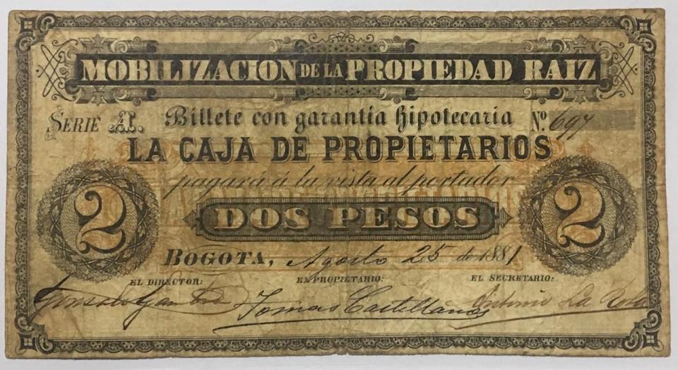 Se trata de un billete de “Mobilización de la propiedad raíz”, de 2 pesos, firmado y fechado el 25 de agosto de 1881 en Bogotà, serie A, impreso por Demetrio Paredes y emitido por la Caja de Propietarios.